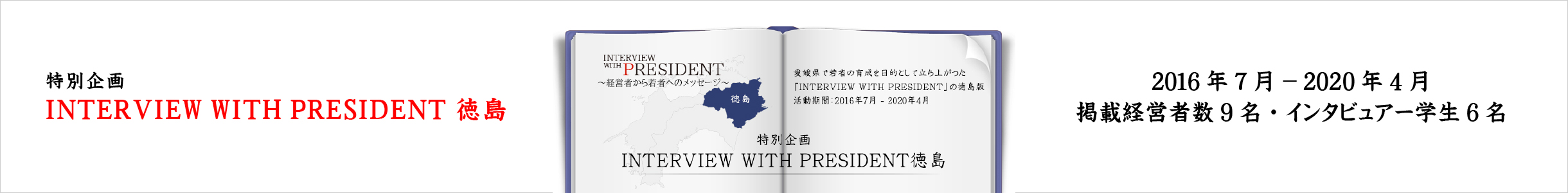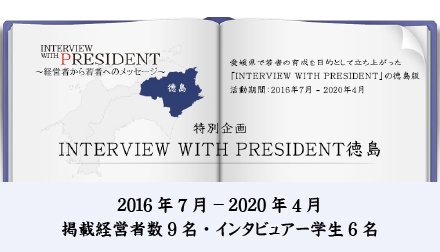 2014年、愛媛県の経営者の「思考・人柄」を皆様に伝えていくとともに、未来ある学生の「経験の場」を作りたいという思いから、「INTERVIEW WITH PRESIDENT」愛媛がスタート。これまで230名以上の経営者の方にご協力頂いています。